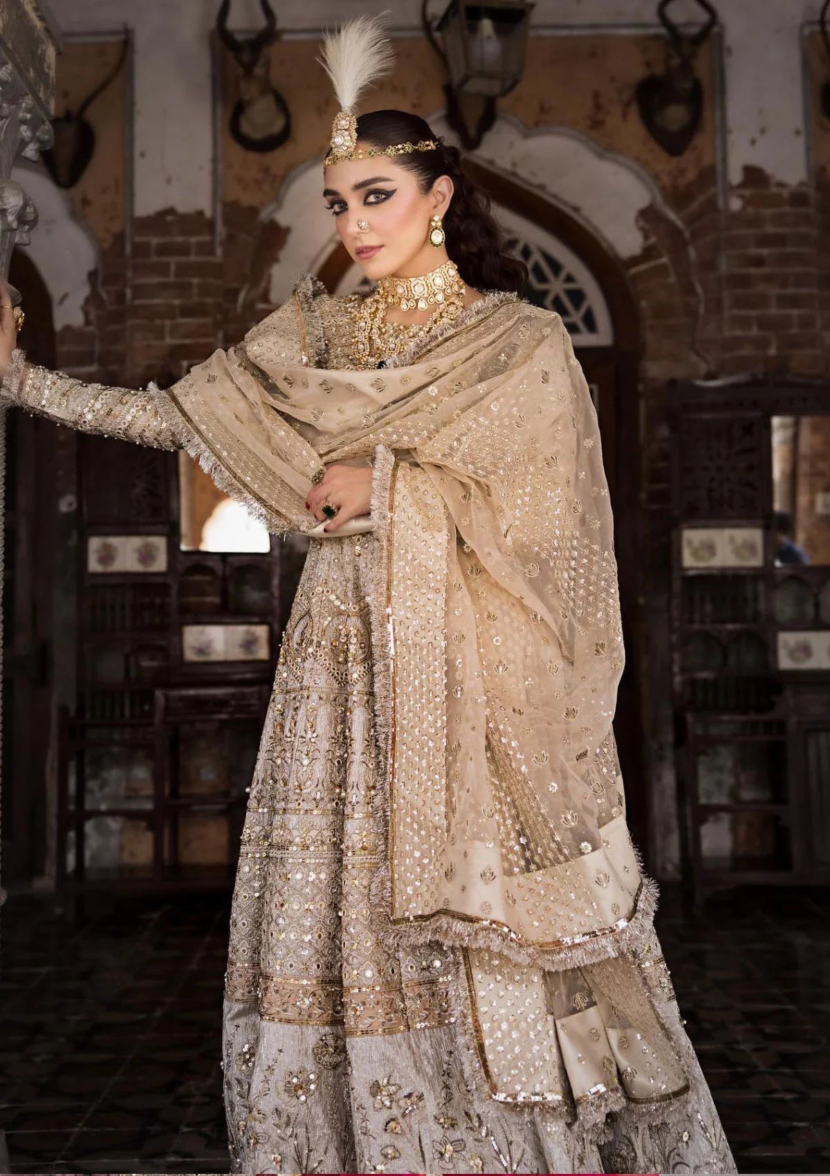 The 'Moti' ensemble, in a delicate palette of sea shell, desert sand, and cream tones, is an exquisite symphony of craftsmanship. Its embroidered shamar tilla net, boasting 16 hand-embellished panels adorned with pearls, stones, and a profusion of gold and silver twin sequins, is a work of art. Two distinct embroidered and embellished patches on satin silk add a unique charm, and the complete hem border on net lends an ethereal touch. The ivory organza dupatta features sequin and motif embroidery, perfectly complementing the allover embroidery and embellishments on the bodice and sleeves. With the satin silk belt adding a finishing touch, 'Moti' is a testament to timeless beauty and the artistry of bridal elegance