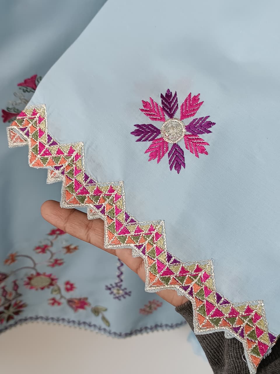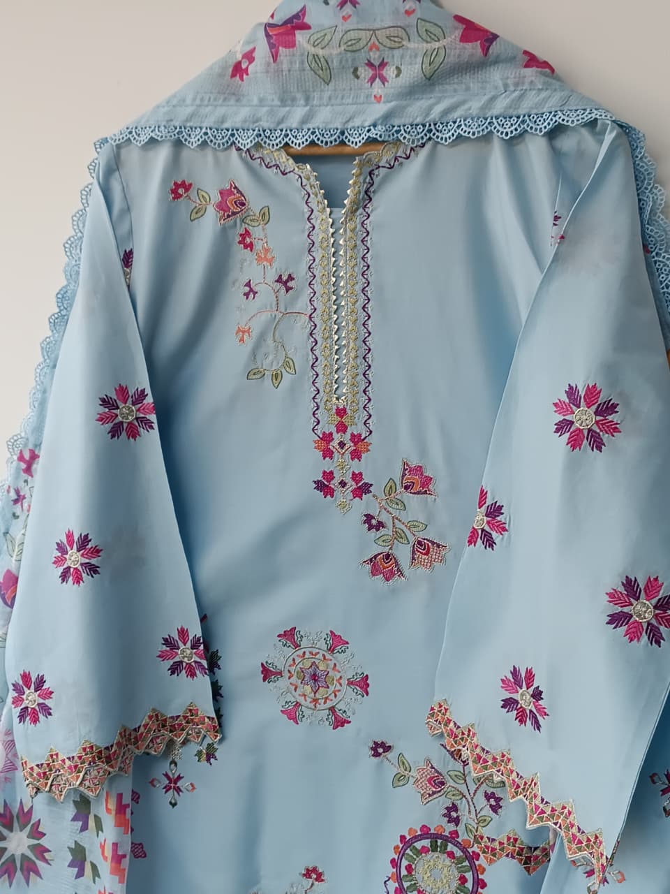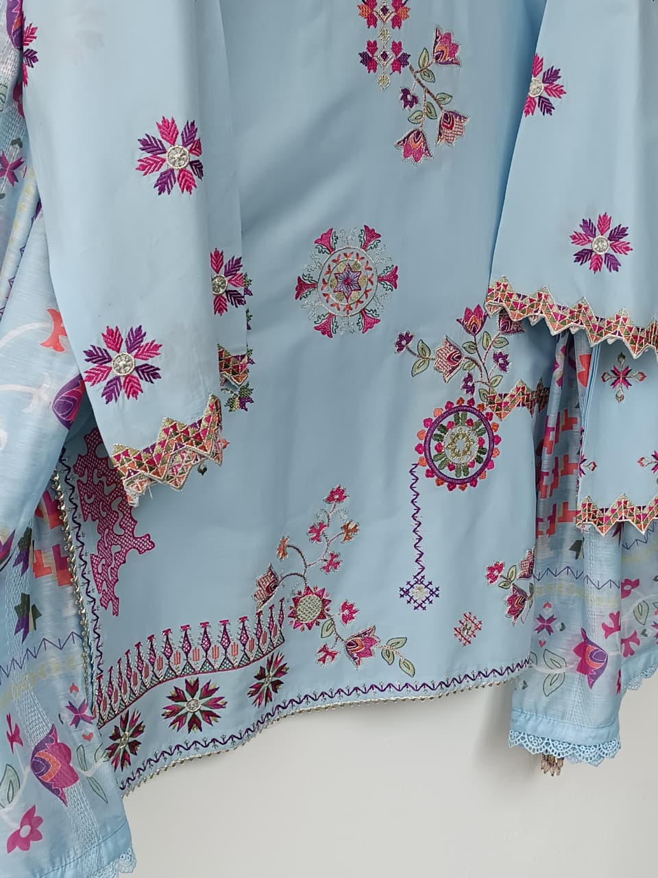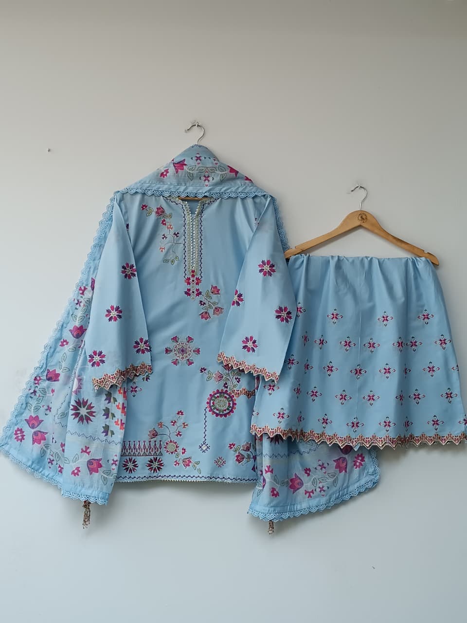 Upgrade your look with this women semi formal 3PC suit by Lubana Store featuring cotton lawn shirt length 35 with stylish sharara flare 27.5 and cotton silk dupatta, beautifully adorned with elegant embroidery work perfect for festive and semi formal occasions.