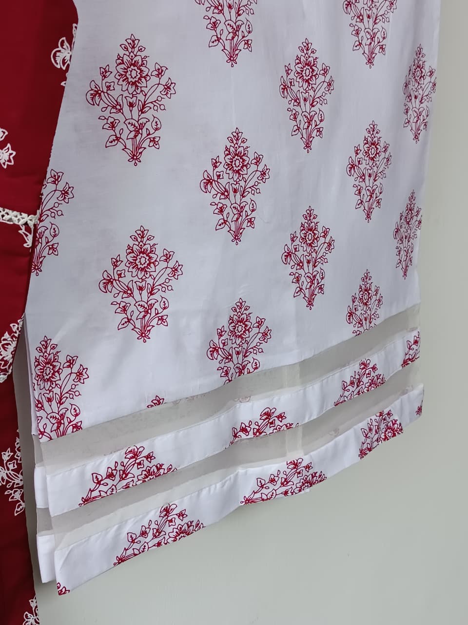 Stay cool and stylish with this women casual 2PC suit by Lubana Store featuring summer cotton shirt length 36 with trouser, adorned with block print and embroidery with organza patch on the neckline, perfect for everyday wear.