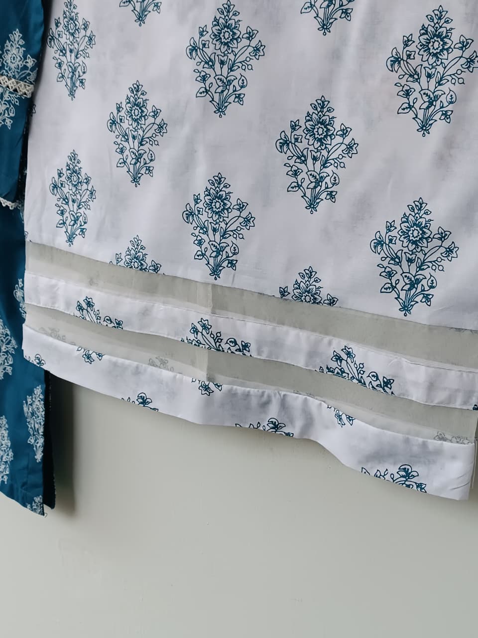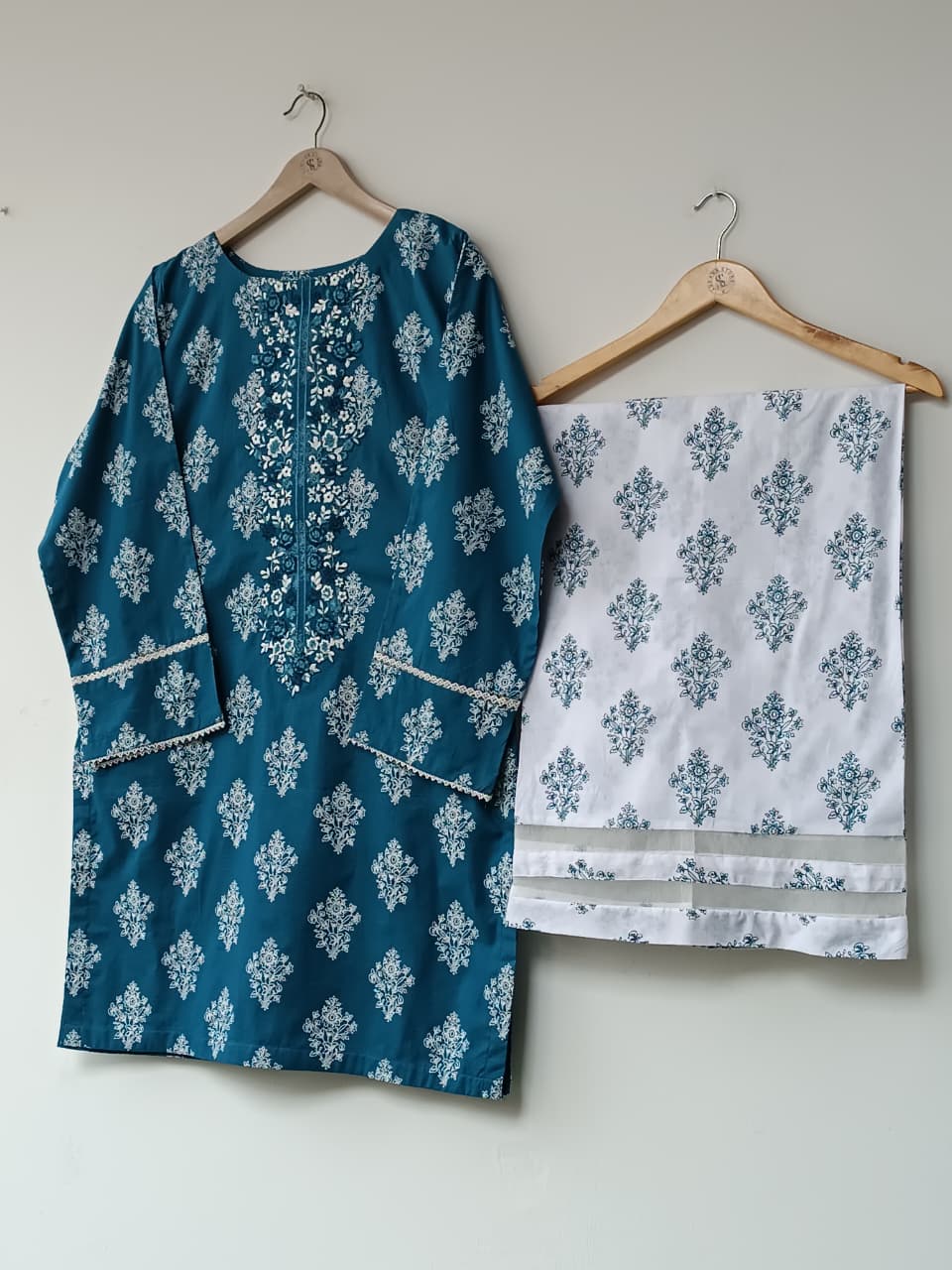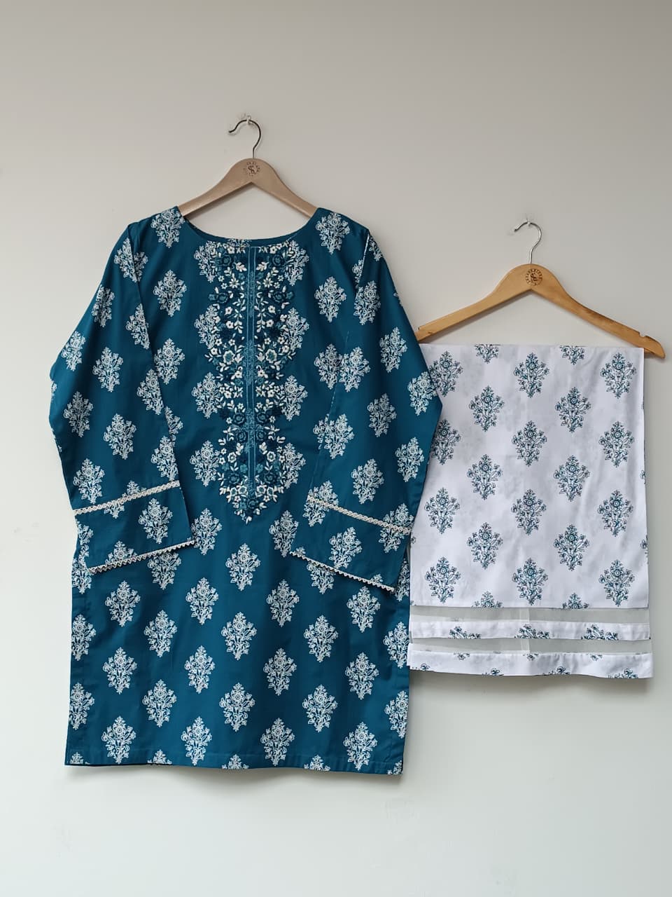 #lubanastore #2pcsuit #casualwear #womencollection #summercotton #blockprint #embroidered #organzapatch #necklinework #pakistanfashion